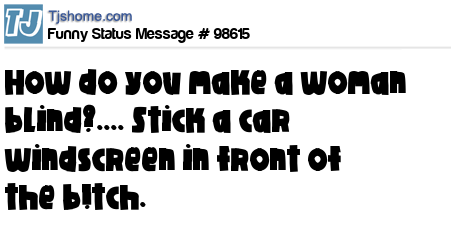 X says How do you make a woman blind?.... Stick a car windscreen in front of the b!tch.