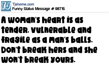 X says A woman's heart is as tender, vulnerable and fragile as a man's balls. Don't break hers and she won't break yours.