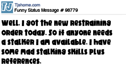 - # 34577 Well, I got the new restraining order today. So if anyone needs a stalker I am available. I have mad stalking skills plus references.