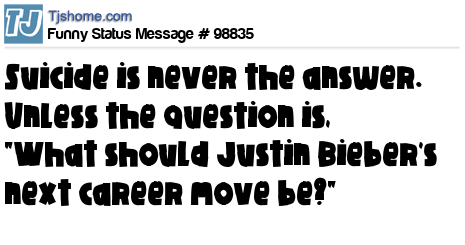 X says Suicide is never the answer. Unless the question is, "What should Justin Bieber's next career move be?"