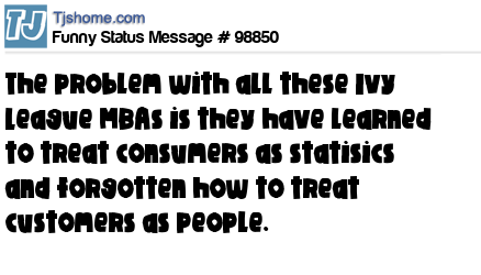 X says The problem with all these Ivy League MBAs is they have learned to treat consumers as statisics and forgotten how to treat customers as people.