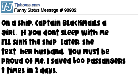 X says On a ship, Captain Blackmails a girl, “If you dont sleep with me I'll sink the ship” Later, she text  her husband, “You must be proud of me, I saved 600 passangers 9 times in 2 days.