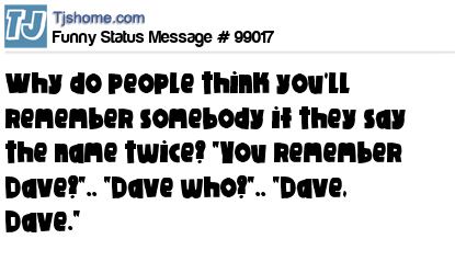 X says Why do people think you'll remember somebody if they say the name twice? "You remember Dave?".. "Dave who?".. "Dave, Dave."