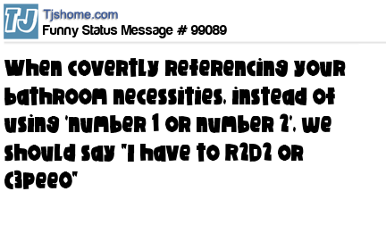 X says When covertly referencing your bathroom necessities, instead of using 'number 1 or number 2', we should say "I have to R2D2 or C3peeO"
