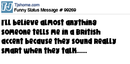 X I'll believe almost anything someone tells me in a British accent because they sound really smart when they talk.......