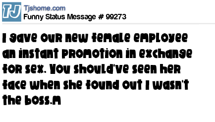 X I gave our new female employee an instant promotion in exchange for sex. You should've seen her face when she found out I wasn't the boss.m
