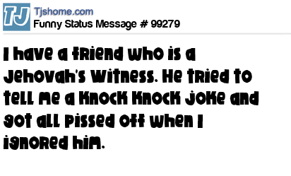 - # 120759 A Jehova Witness tried to tell me a "Knock Knock" joke, but got all mad cause I didn't answer him.