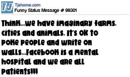 - # 43190 Facebook is basically a crazy house. People poke each other all day, have an imaginary pet, farm, and city, talk to walls, and have random arguments with people.