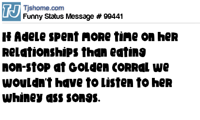 X  If Adele spent more time on her relationships than eating non-stop at Golden Corral we wouldn't have to listen to her whiney ass songs.