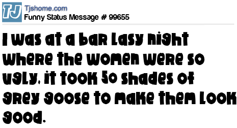 X I was at a bar lasy night where the women were so ugly, it took 50 shades of grey goose to make them look good.