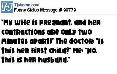 X "My wife is pregnant, and her contractions are only two minutes apart!" The doctor: "Is this her first child?" Me: "No, this is her husband."