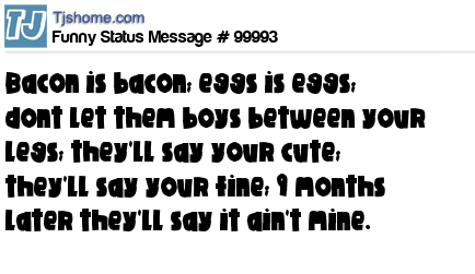 - # 39942 Bacon is bacon; eggs is eggs; dont let them boys between your legs; they'll say your cute; they'll say your fine; 9 months later they'll say it ain't mine