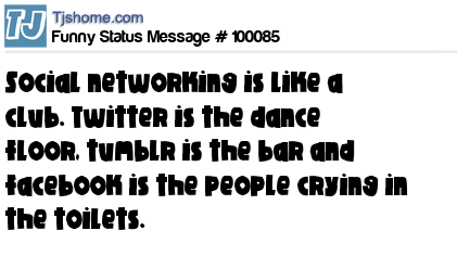 X Social networking is like a club. Twitter is the dance floor, tumblr is the bar and facebook is the people crying in the toilets.
