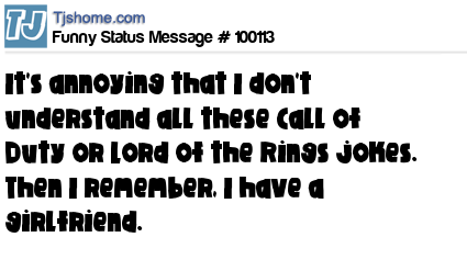 X It's annoying that I don't understand all these Call of Duty or Lord of the Rings jokes. Then I remember, I have a girlfriend.