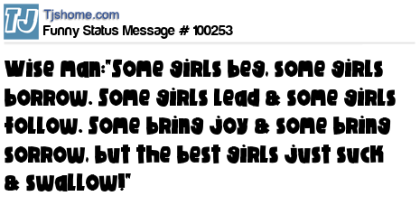 X Wise man:"Some girls beg, some girls borrow. Some girls lead & some girls follow. Some bring joy & some bring sorrow, but the best girls just suck & swallow!"