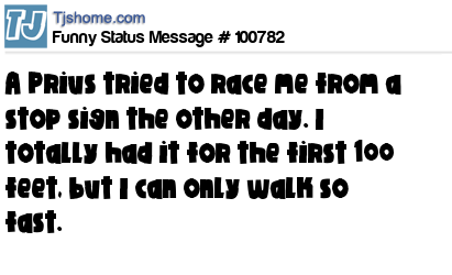 X A Prius tried to race me from a stop sign the other day. I totally had it for the first 100 feet, but I can only walk so fast.
