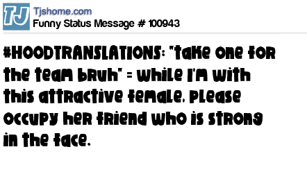 X is #HOODTRANSLATIONS: "take one for the team bruh" = while I'm with this attractive female, please occupy her friend who is strong in the face.