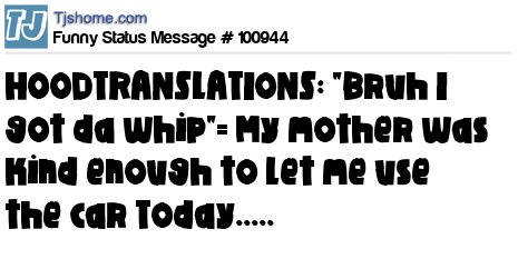 X is HOODTRANSLATIONS: "Bruh I got da whip"= My mother was kind enough to let me use the car Today.....