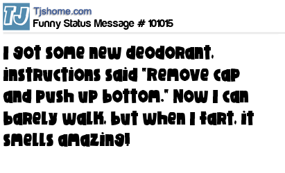 - # 20986 I got a new stick deodorant today. The instructions said: Remove cap and push up bottom. I can barely walk, but whenever I fart the room smells lovely.