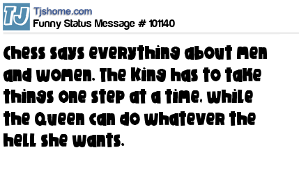 - # 124319 Chess says everything about men & women. The King has to take things one step at a time, while the Queen can do whatever the hell she wants.
