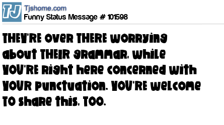 X THEY'RE over THERE worrying about THEIR grammar, while YOU'RE right here concerned with YOUR punctuation. YOU'RE welcome TO share this, TOO.