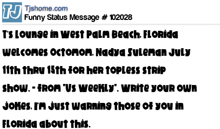 X T's Lounge in West Palm Beach, Florida welcomes Octomom, Nadya Suleman July 11th thru 15th for her topless strip show. - from "Us Weekly". Write your own jokes, I'm just warning those of you in Florida about this.