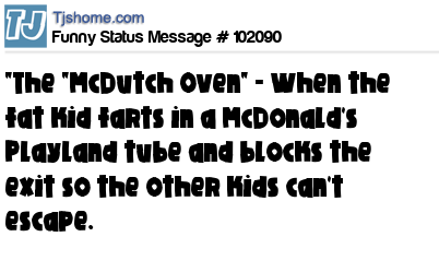 - # 101278 The "McDutch Oven" - When the fat kid farts in a McDonald's Playland tube and blocks the exit so no kid can escape.