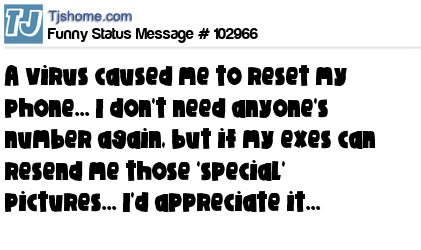 X says A virus caused me to reset my phone... I don't need anyone's number again, but if my exes can resend me those 'special' pictures... I'd appreciate it...