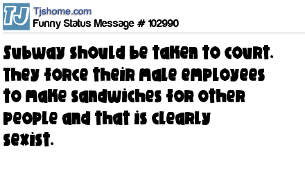 - # 103744 Ahh, Subway. It's the only place on Earth where you can force a woman to make you a sandwich and she can't tell you to f$ck off.