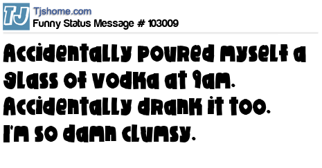 X says Accidentally poured myself a glass of vodka at 9am. Accidentally drank it too. I'm so damn clumsy.