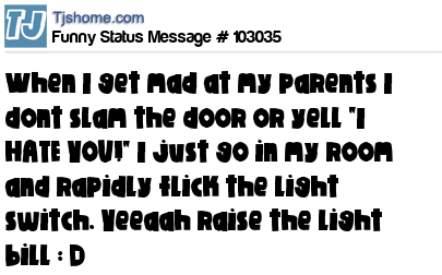 X is When I get mad at my parents I dont slam the door or yell "I HATE YOU!" I just go in my room and rapidly flick the light switch. Yeeaah raise the light bill : D