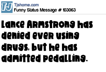 - # 121836 So Lance Armstrong admitted to using drugs but he won't admit that he used a car instead of a bike in all his wins.