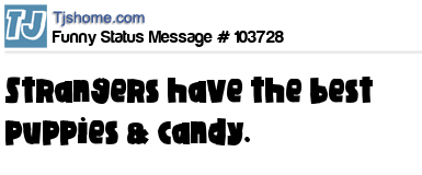 - # 153402 Okay kids don't ever talk to strangers or take candy from strangers or go to stranger's houses except on the day we worship the devil.
