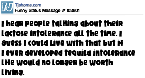 X says I hear people talking about their lactose intolerance all the time. I guess I could live with that but if I ever developed tequila intolerance life would no longer be worth living.