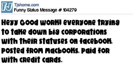 X heyy Good work! everyone trying to take down big corporations with their statuses on facebook, posted from macbooks, paid for with credit cards.