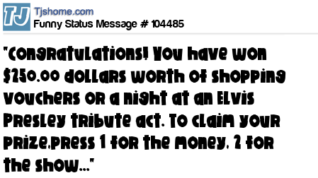 - # 104421 Just got this text message, not sure if it's a prank:"Congratulations! You have won £250 of shopping vouchers or a night at an Elvis Presley tribute act. To claim your prize, press 1 for the money, 2 for the show..."