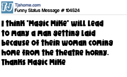 X I think "Magic Mike" will lead to many a man getting laid because of their woman coming home from the theatre horny. Thanks Magic Mike