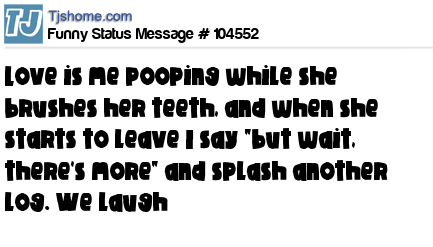 X says Love is me pooping while she brushes her teeth, and when she starts to leave I say "but wait, there's more" and splash another log. We laugh