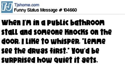 X When I'm in a public bathroom stall and someone knocks on the door, I like to whisper, "lemme see the drugs first." You'd be surprised how quiet it gets.