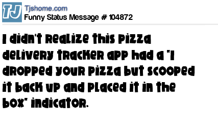 - # 92186 I appreciate the transparency Domino's pizza tracker provides, but updates like "Carl dropped your pizza" & "5 second rule" are a bit much.