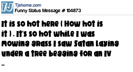 X is It is so hot here ( How hot is it ) . It's so hot while I was mowing grass I saw Satan laying under a tree begging for an IV ..