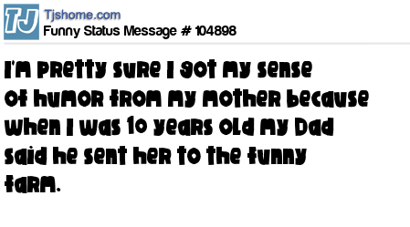 X I'm pretty sure I got my sense of humor from my mother because when I was 10 years old my Dad said he sent her to the funny farm.