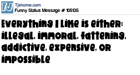 X is Everything I like is either: illegal, immoral, fattening, addictive, expensive, or impossible