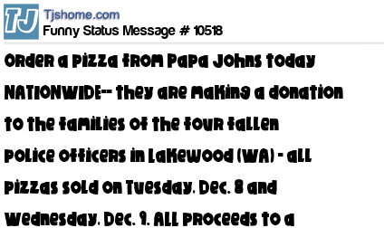X says Order a pizza from Papa Johns today NATIONWIDE-- they are making a donation to the families of the four fallen police officers in Lakewood (WA) - all pizzas sold on Tuesday, Dec. 8 and Wednesday, Dec. 9. ALL proceeds to a trust for their nine children