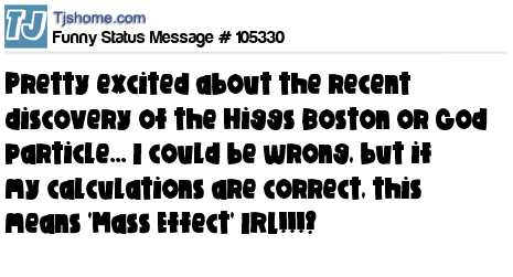 X is pretty excited about the recent discovery of the Higgs Boston or God particle... I could be wrong, but if my calculations are correct, this means 'Mass Effect' IRL!!!?