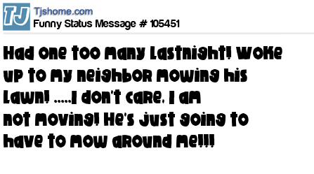 X is Had one too many lastnight! Woke up to my neighbor mowing his lawn! .....I don't care, I am not moving! He's just going to have to mow around me!!!