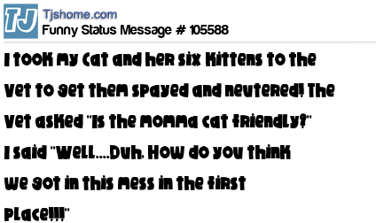 X is I took my Cat and her six kittens to the Vet to get them spayed and neutered! The Vet asked ''Is the momma cat friendly?'' I said ''Well....Duh, How do you think we got in this mess in the first place!!!''