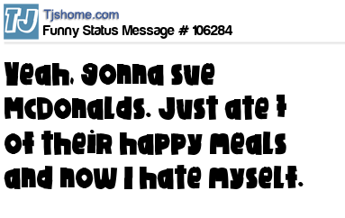X is Yeah, gonna sue McDonalds. Just ate 7 of their happy meals and now I hate myself.
