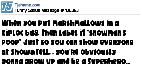 X  When you put marshmallows in a ziploc bag, then label it "snowman's poop" just so you can show everyone at Show&Tell,,,, you're obviously gonna grow up and be a Superhero...