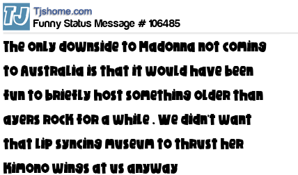 X is The only downside to Madonna not coming to Australia is that it would have been fun to briefly host something older than ayers rock for a while . We didn't want that lip syncing museum to thrust her kimono wings at us anyway